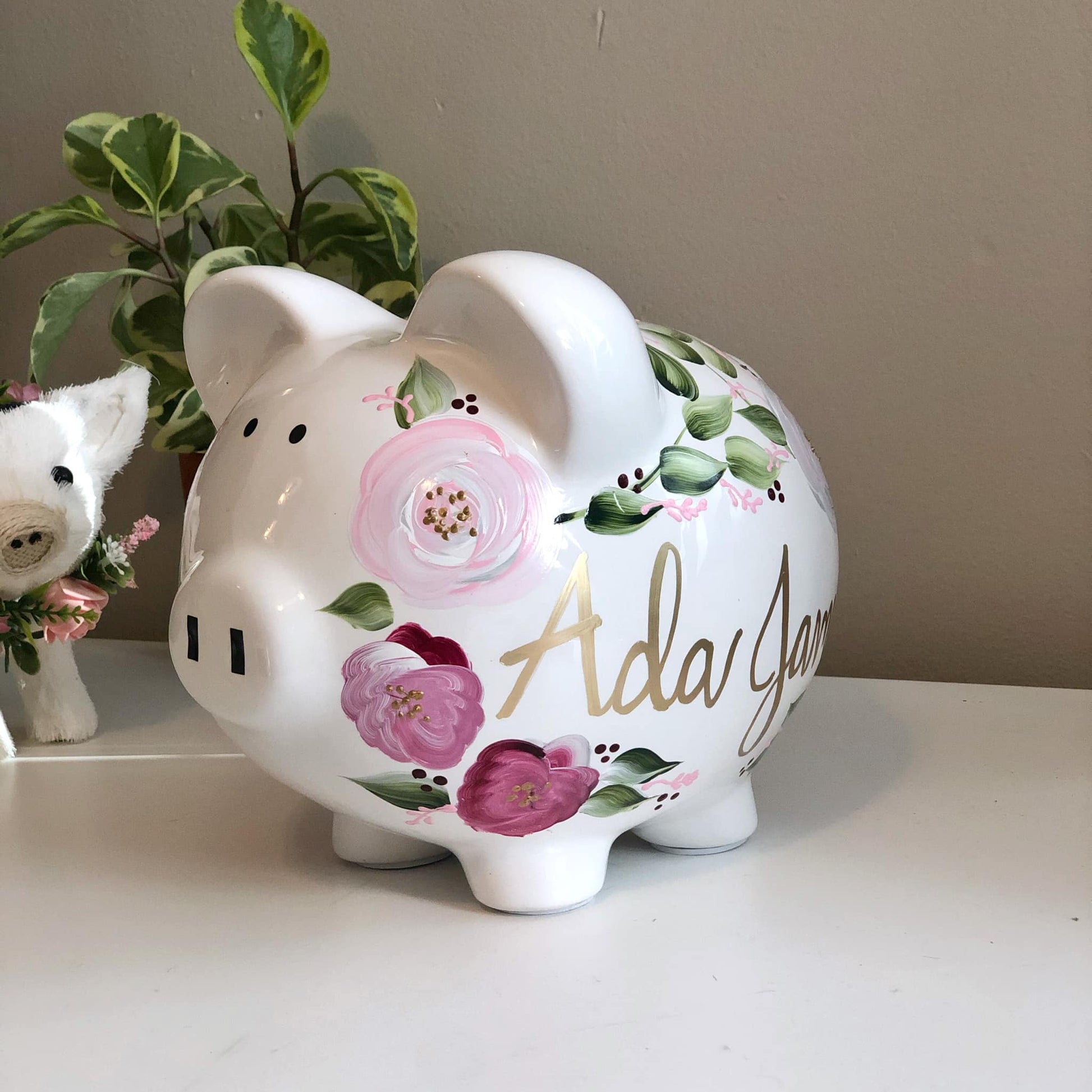 This charming hand-painted ceramic piggy bank features a beautiful dark pink and light pink floral design, perfect for a baby girl's nursery or child's room. Each piece is carefully hand-painted with delicate flowers, making it a unique keepsake gift.